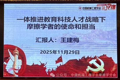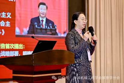 开幕式后,举行了百名专家讲党课活动,太原科技大学王建梅教授以《一体推进教育科技人才战略下摩擦学者的使命和担当》为题,为在场专家带来了一堂立意高远、内容深刻的专题党课,深刻解读了国家一体化推进教育、科技、人才工作的战略部署与核心要义,激励广大摩擦学同仁将个人研究融入国家发展大局,为实现高水平科技自立自强贡献智慧与力量。