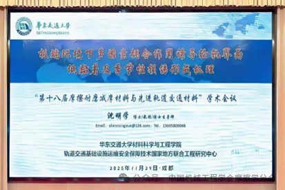 在秋冬交替,落叶静美时节,由中国机械工程学会主办,中国机械工程学会摩擦学分会、西南交通大学材料科学与工程学院和材料先进技术教育部重点实验室承办的“第十八届摩擦耐磨减摩材料与先进轨道交通材料学术会议”于11月28日至12月1日在成都召开。本次会议共设置12个大会特邀报告和三个分会场,吸引了来自国内外69家单位的263名代表注册参会,深入研讨了摩擦学与轨道交通材料领域的前沿进展。